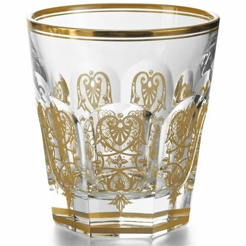 Celebrated for its elaborate design, Harcourt stemware has been in the hands of power throughout the ages. The Harcourt Empire Tumbler glass shares the same structural outline as the original vessel with the addition of exquisite golden embellishment. The flat cut pattern of the bowl has golden decorative shapes applied with a light hand to the flat cut pattern of the glass, and the lip and base of the tumbler have a gilded trim. The glass sparkles luxuriously with both lucid crystal and gold.
