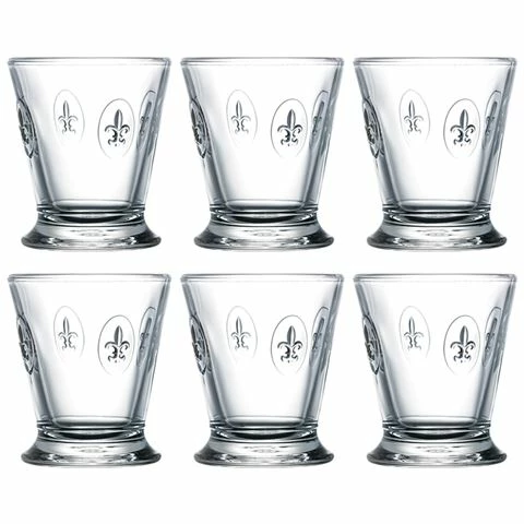 - Fleur de Lys motif on each glass with a slightly skirted base