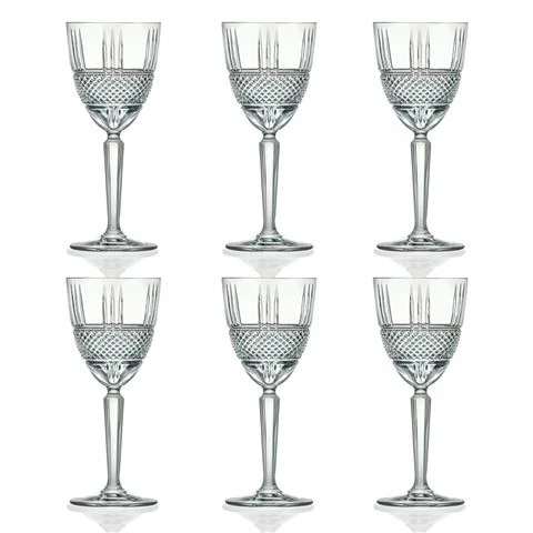 Stylish and richly decorated, the RCR Cristalleria Brillante Wine Glasses, will soon become essential for all gatherings. Crafted in RCR Luxion crystal, these vintage inspired glasses have remarkable brightness and clarity. The glass cut design is luminous and gleams with refracted light.