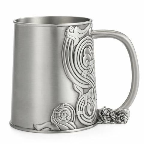 Derived from designs carved into king chess pieces, reeded tendrils disgorged by beasts’ swirl around the tankard’s body, its handle terminating in the figure of a dragon biting itself. Whether mead or IPA, pewter keeps that quaff crisp.